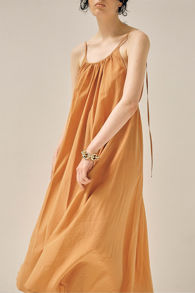 細めのストライプ柄に、歩くたび揺れる表情感のあるキャミソールワンピース。胸元のギャザー、バックシャンなデザインで女性らしさをプラス。インナーやサマーニット、シャツなどの重ね着で着まわしの効く1着です。夏らしい気分の上がるオレンジと、シックな印象で着られるネイビーの2色をご用意。