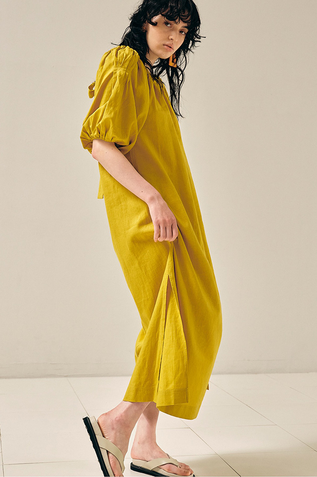 夏らしいリネンの風合いをもつロングワンピース。襟ぐりのギャザーとパフスリーブデザインで、華やかさを演出。ネックラインはリボンで開き具合の調整が可能なので、広く開けたり、ワンショルでの着こなし方も楽しめます。