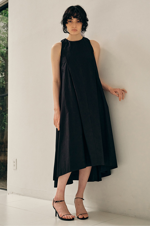 ネック周りをすっきりと自然な肌見せが叶うアメリカンスリーブのワンピース。肌離れがよくハリのある生地感に、裾の前後差のあるドレープが上品な印象。体のラインを拾いにくく、スタイルアップを期待できるフレアシルエットも嬉しいポイントです。