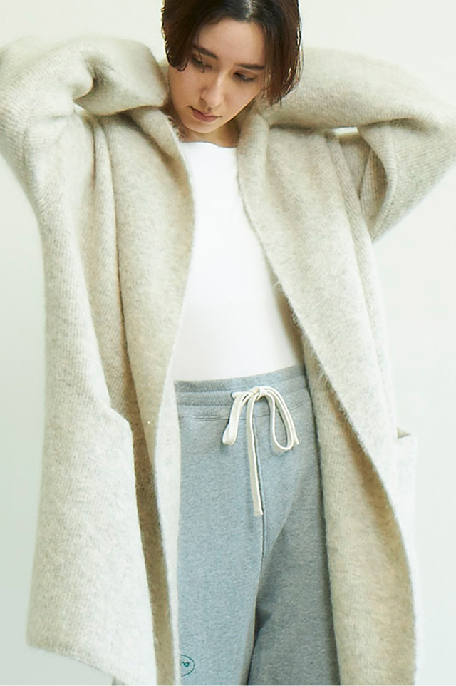 ヒップまで暖かく、毛足の高級感を引き出したニットガウン。コート感覚で羽織れる1枚あると嬉しいアイテム。
