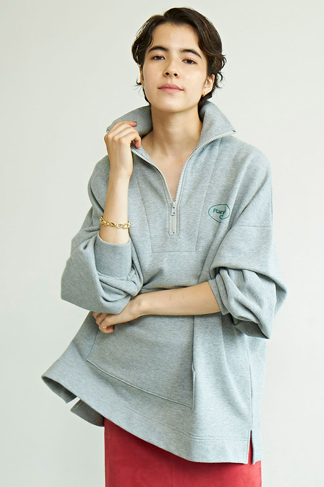 今シーズンのブランドコンセプトのロゴを刺しゅうしたハーフジップスウェット。メンズライクなシルエットながら、軽い着心地。同素材のスウェットパンツとセットアップでお召しいただけます。