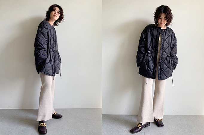 昨年大人気だったキルティングコートが今年も登場しました。体が大きく見えないすっきりしたシルエットなので、ボトムスのバランスに困らずスタイリングしやすいです。ウエストを軽く絞るのがおすすめ。(STAFF 161㎝)