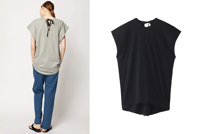 バックスタイルのリボンがポイントのクルーネックカットソー。前後差のある着丈と、ゆったりシルエット、二の腕部分をカバーしてくれるフレンチスリーブで1枚で着こなしやすいアイテムです。柔らかな天竺素材を使用しているので、真夏の暑さも快適に過ごせます。