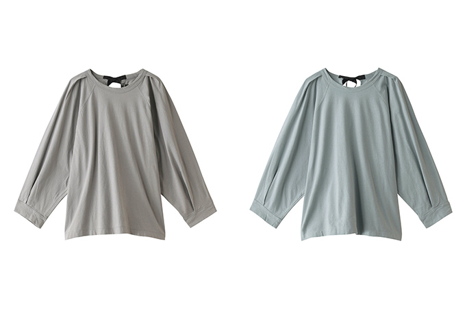 同様の素材を使用した、バックリボンのロングスリーブカットソー。肩や袖口にギャザーを加えて、立体感のあるシルエットでデザインしています。
