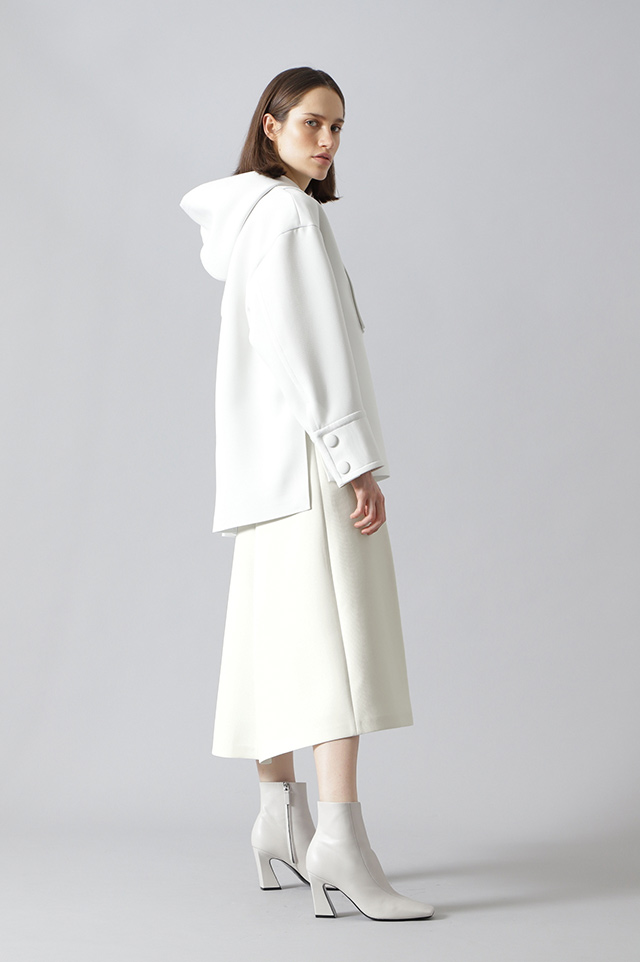 カジュアルからフェミニンまで、あらゆるテイストにマッチするスカート。トリプルクロスポリエステル素材が、上品なふくらみと軽やかな着用感を叶えます。広がりを抑えたミディ丈シルエットと、落ち着いたワンカラーが大人の着まわしにふさわしい。
