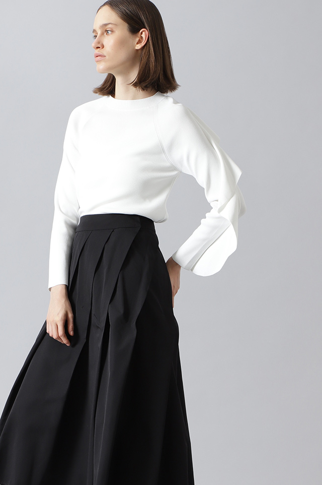 左袖のラッフルが目を惹くニットプルオーバー。清涼感のあるアセテートとナイロンのストレッチ素材で、ドライタッチな着心地。トップスインでもアウトでもサマになる、スタイリング力が決め手。きれいめなお出かけスタイルやオフィスシーンに取り入れたい。