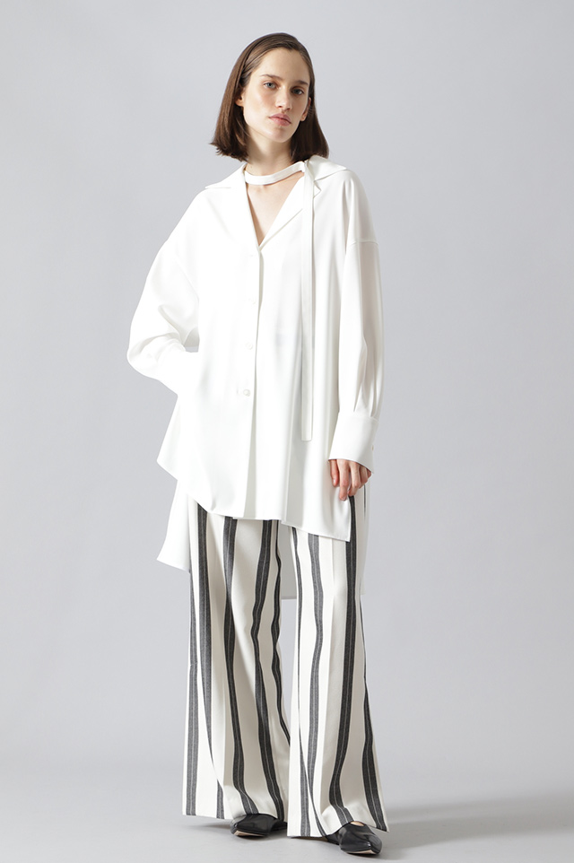 ゆとりのあるサイジングとオープンカラーが、ヌケ感をもたらすブラウス。ソフトでしなやかな肌触りと、上品な落ち感を備えたマテリアルが魅力的。モノトーンカラーで合わせるボトムを選ばないのがうれしい。メインにも、ライトなアウターとしても着まわせる1着。