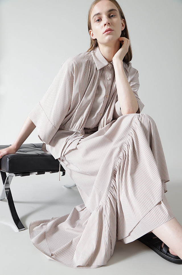 セットアップでのスタイリングもおすすめ! フェミニン要素を取り入れたソフトストライプブロード