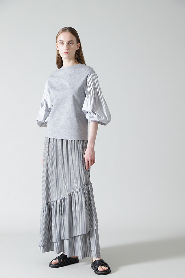 シンプルながら1枚でサマになるデザインカットソー。トレンドのボリュームスリーブは、ハリ感のあるコットン素材&細やかなタックが立体的なフォルムを生み出すカギ。身頃は無駄なくシンプルにまとめ、気軽にデイリーにオンできそう。