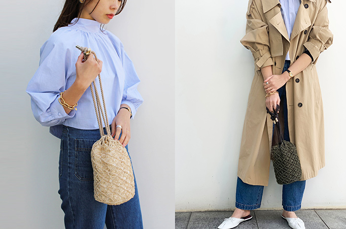 ファッション性と機能性を兼ね備えたデザインと、高いクオリティが支持されている日本発のバッグブランド「VIOLAd'ORO(ヴィオラドーロ)」。トレンド感がありながらも実用的なカゴバッグは毎年人気のアイテムです。透け感のあるマクラメ編みの巾着バッグは一点投入でコーディネートを軽快なムードに仕上げてくれるので、気温が安定しないこの時期にこそワードローブに加えたいアイテム。インナーバッグ付きで中身が見える心配もなく、上品な華やかさがあるので気分もぐっと上がりそう。