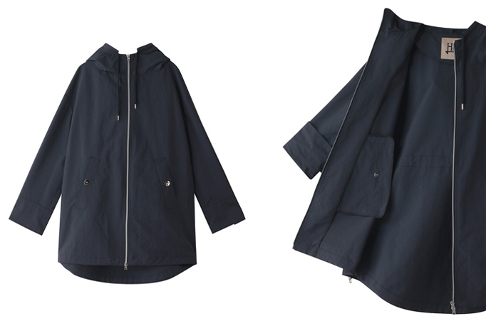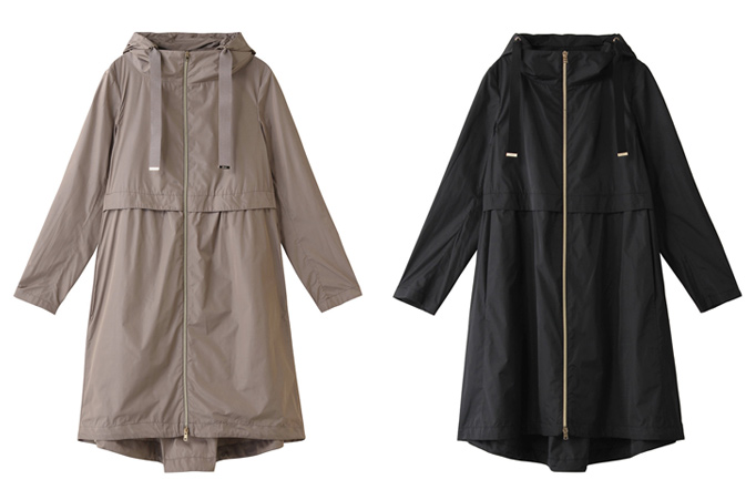 身頃に切り替えデザインのあるフーデットコート。タイムレスなデザインで、汎用性の高いモデルです。はっ水加工が施されている、光沢と張り感のある薄地ポリエステルを使用しています。