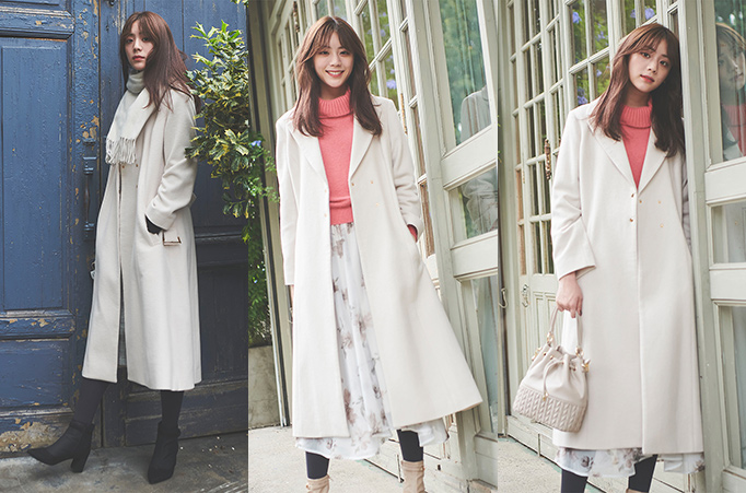 ダブルボタンのマニッシュなデザインに、毛並みをなめらかにしたビーバー仕立て。小柄な方でもバランスの取りやすいフレアシルエットで、一枚でサマになるロングコート。パステルカラーのニットワンピで可愛らしさをミックスするのが鍵。
