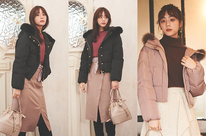 フードには取り外しできるFOXファーを、後ろの裾には編み上げリボンを施し、カジュアルに振れがちなダウンコートをラグジュアリーへと昇華。まろやかなピンクベージュの色味も相まって、フェミニン度は上々。チュールスカートでコーデに軽さと動きをプラスして。