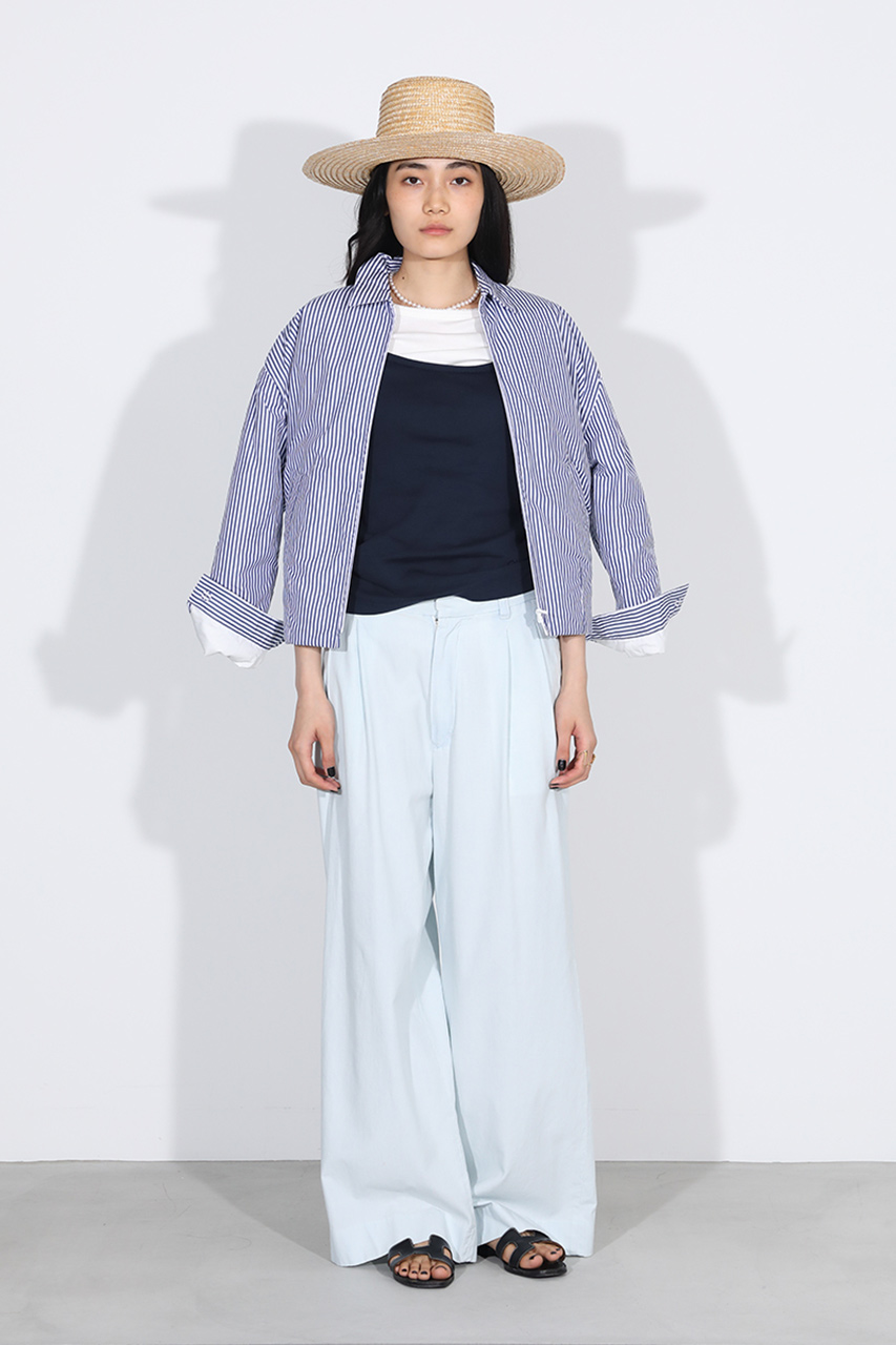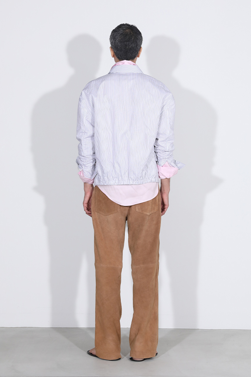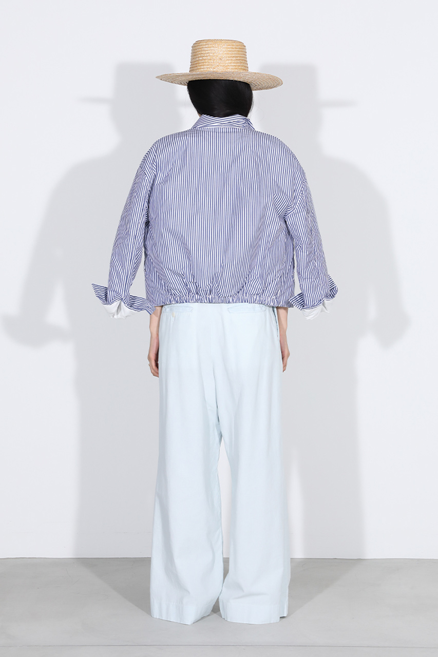マルチストライプは長綿ブロードならではのハリと反発感を活かし、クリーンなBLUEストライプが軽快な印象をプラス。Wジップ仕様で着こなしのアレンジも楽しめる、軽さと構築的なフォルムのバランスが光るモデルです。