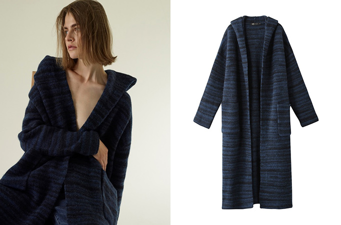 イタリアの大手原料メーカーPecci社のニット素材でシーズンムードたっぷりに仕上げたフーディロングコート。かすれたようなニュアンスのあるボーダー柄がポイントに。カーディガンのように気軽に羽織れる軽さも魅力。秋のアウターとして活躍します。