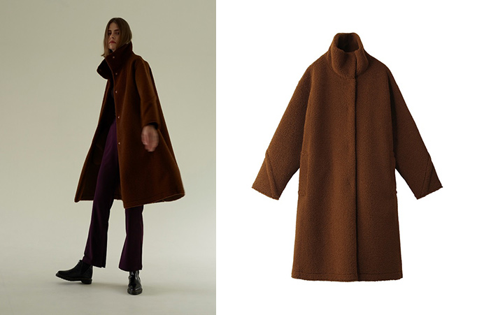 合皮とボアのボンディング生地で作ったフェイクムートンを使用したテントシルエットのコート。後ろに贅沢に入れた大きめのタックと袖の切り替えデザインがポイント。襟がスタンドカラーなので、防寒にも適しているのと、やや甘めのボディデザインを辛口に演出。