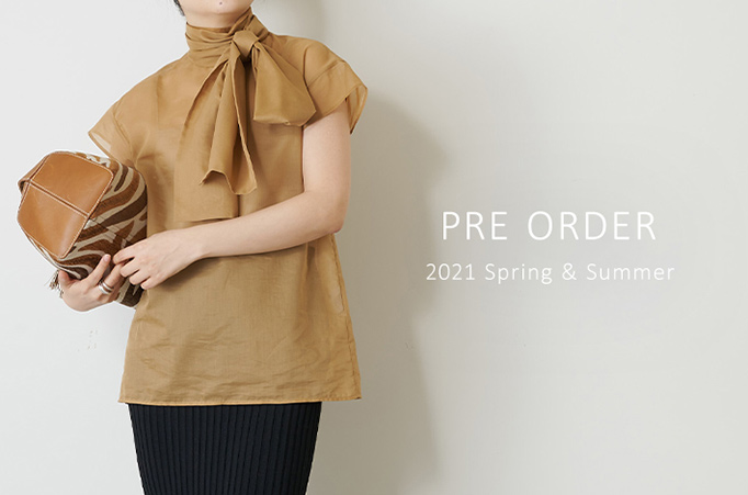 2021春夏の先行予約に新作を追加しました。レイヤードでも映えるフレンチスリーブのボウタイブラウスや、スタイルアップ効果抜群のサテンパンツなど、一枚で決まるデザインアイテムが揃いました。ぜひご覧ください。